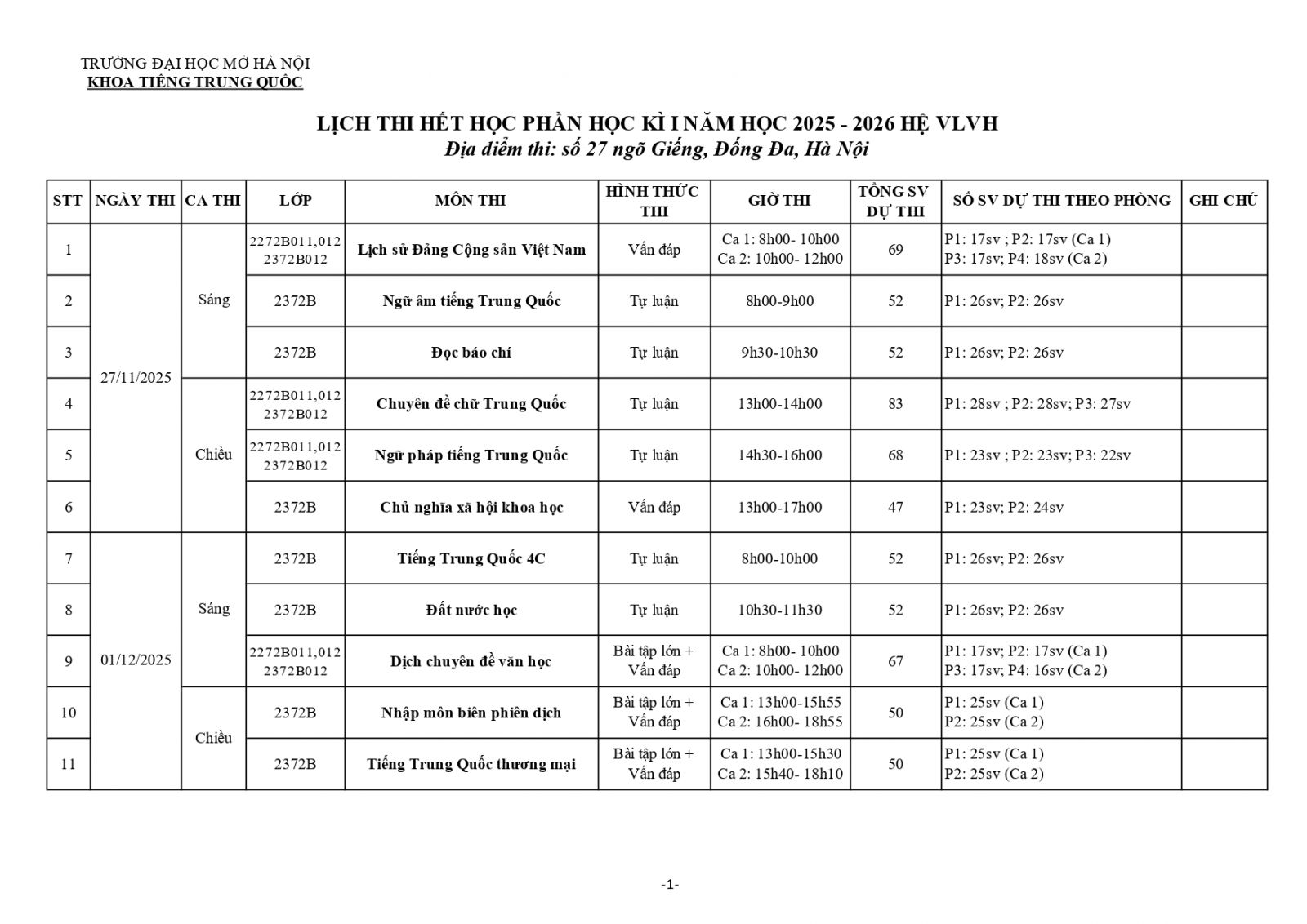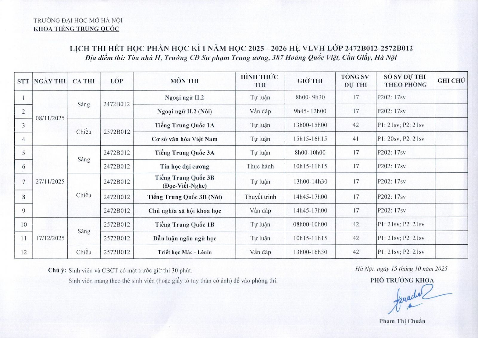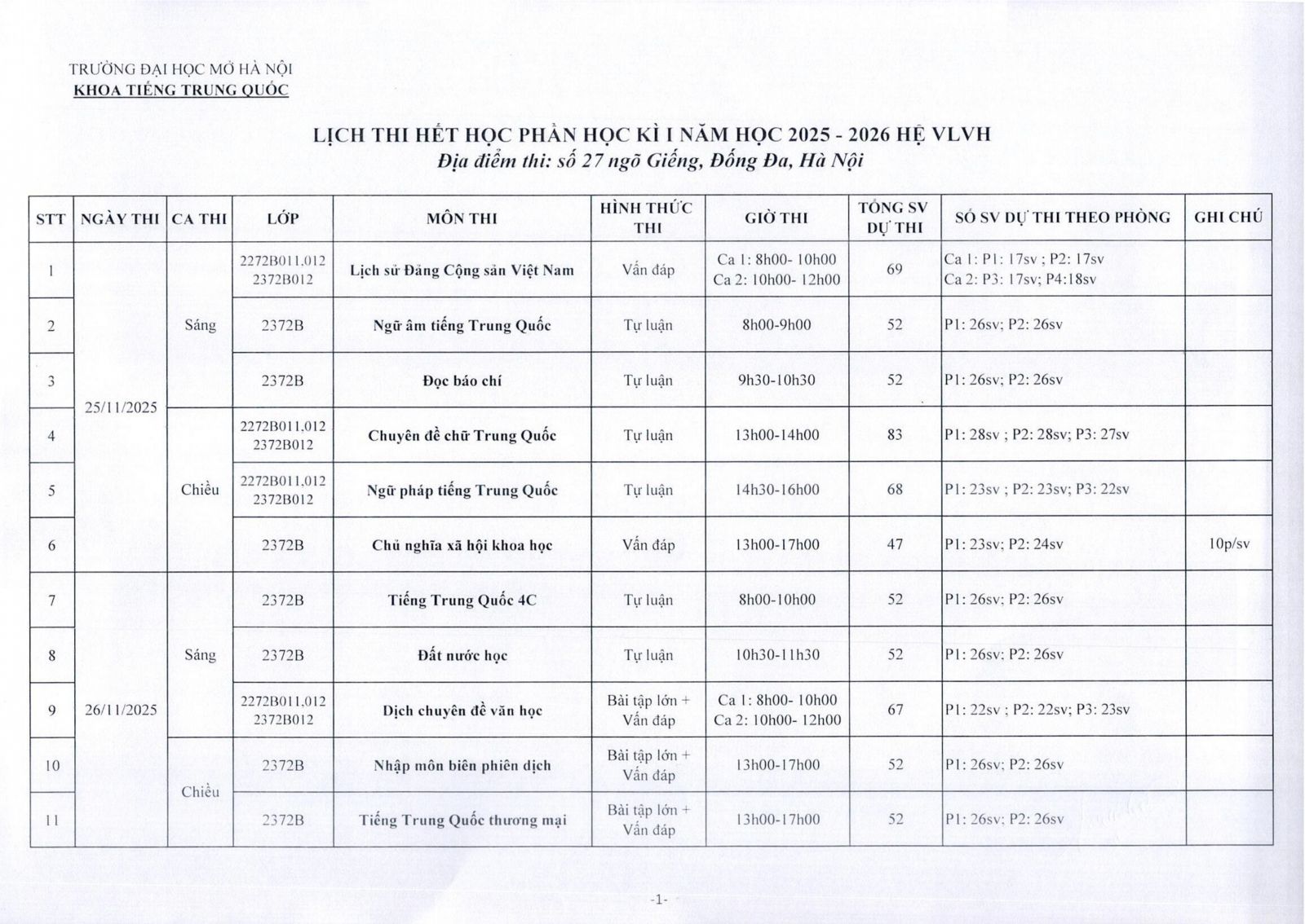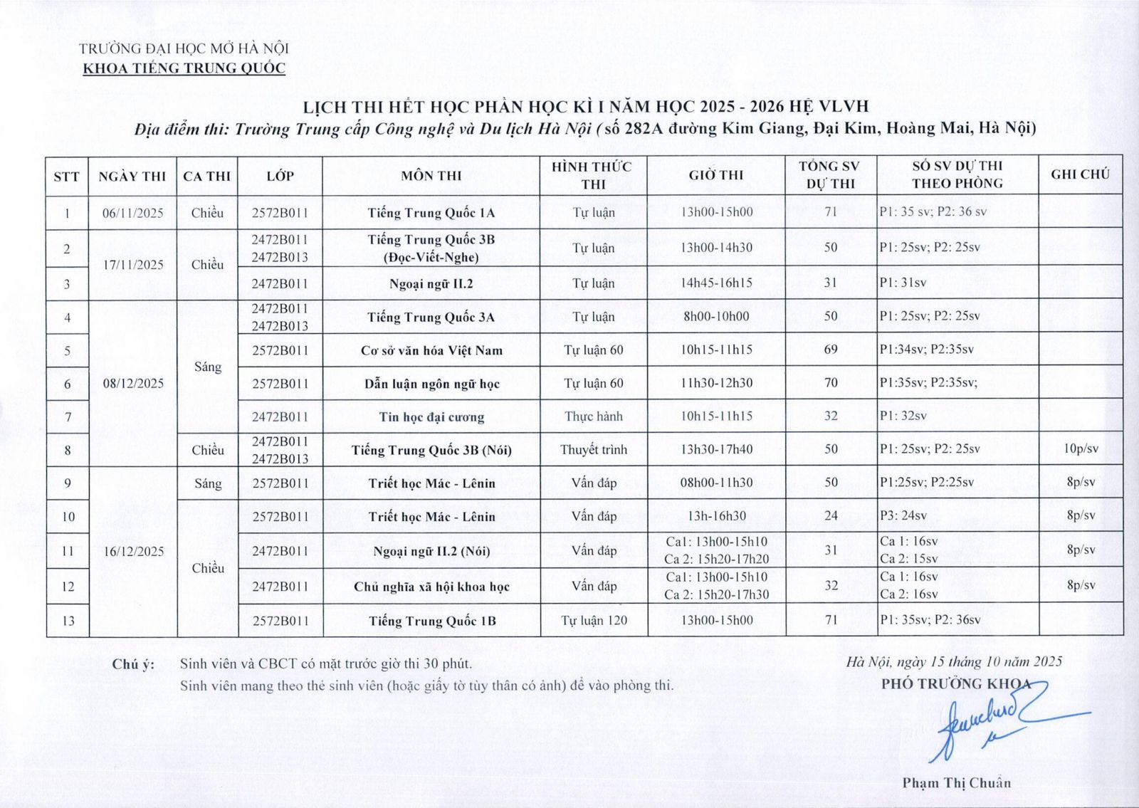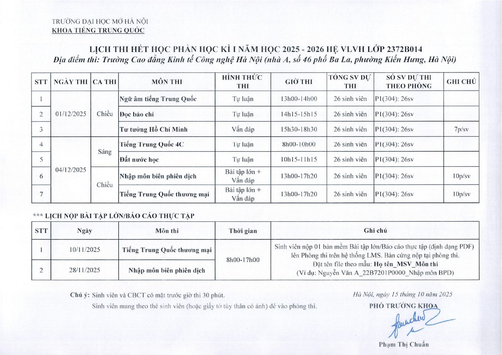 Thông báo lịch thi học kỳ I năm 2025-2026 hệ Vừa làm vừa học